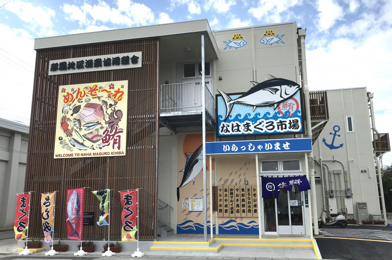 2023年11月に那覇市港町にてオープンした「なはまぐろ市場」。泊いゆまちの奥の敷地にあるこちらの市場は2階建てになっており、1階には水産業者7社が入居し、泊漁港で水揚げされたキハダ・メバチ・クロマグロ・ビンナガの4種類のまぐろを中心とした鮮魚販売を行っています。2階にはイートインスペースやデッキテラスがあり、1階で購入した水産物の飲食が可能となっています。さらに、赤ちゃんルームもあるので、お子様連れの方にもぴったりです。