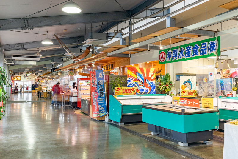 泊漁港内に設けられた、20件以上の鮮魚店が軒を並べる直売所です。まぐろの他、季節によって変わる旬の魚介や、沖縄ならではのカラフルな熱帯魚、朝水揚げされた新鮮な魚介類などが並びます。立ち食いできるスポットや手作りお総菜もあり、売り切りごめんで閉店する店舗もあるので、朝早くからのご来店がおすすめです。