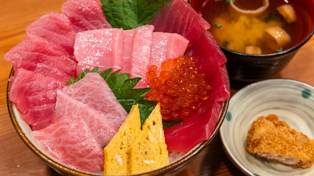 『至福のまぐろ丼』は鮮やかな赤身、中トロ、カマトロを味わうことができる贅沢な一品。濃厚でもっちりしていて、口の中でとろけるまぐろは絶品です。赤身はその時期に獲れる新鮮なキハダやメバチが提供されます。付け合わせのまぐろカツもサクサクの衣とジューシーなまぐろとの相性がぴったりです。
