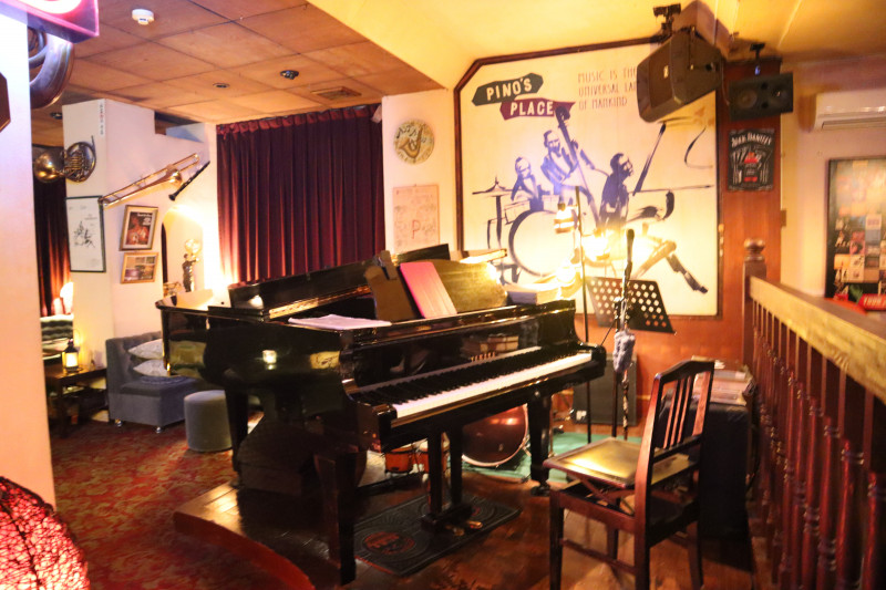 開業から41年を迎えるJazz Live House ピノスプレイスは、那覇市東町にあるジャズバー。店内は仄暗く、客席はグランドピアノとドラムをぐるりと囲むように配置されており、ところどころで灯る間接照明の暖色がかなりムーディな雰囲気を演出します。