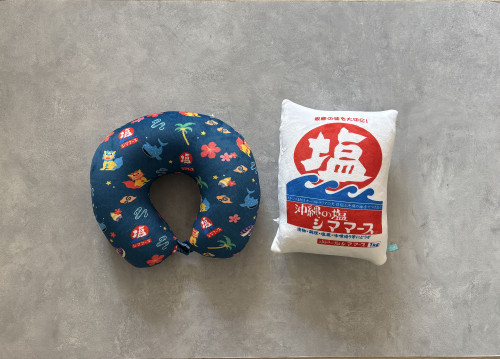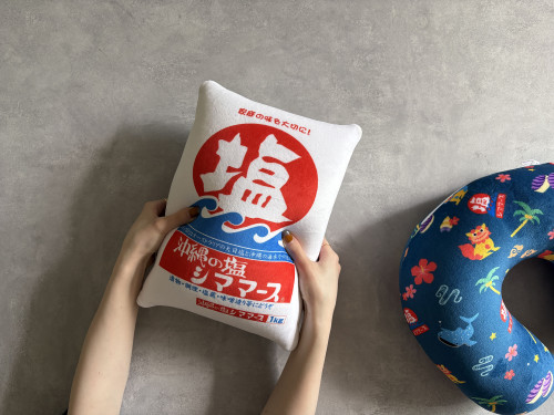 雑貨ブランド【ちゅらさんぽ】と【シママース】とのコラボグッズが新発売!沖縄料理の定番塩として愛される【シママース】のパッケージがそのままクッションになったデザインです。パッと見、本物かな?と思ってしまうほど絶妙に再現されています。側面のファスナーを開くと中からネックピローの形をしたした生地があらわれて、中のビーズを移動させるとあっという間にネックピローに大変身!お家ではクッションとして、旅行先ではネックピローとしても活躍する2WAYクッションです♪
