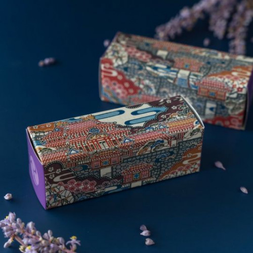 紅芋、シークワーサー、黒糖、塩あん&クリームの4種のフレーバーを展開。パッケージには伝統工芸「紅型」を採用し、特別感も演出。売上の一部は首里城復興支援に寄付されます。もっちり、パリッとした皮と上品な甘さのあんが調和した、高級感漂う一品です。
