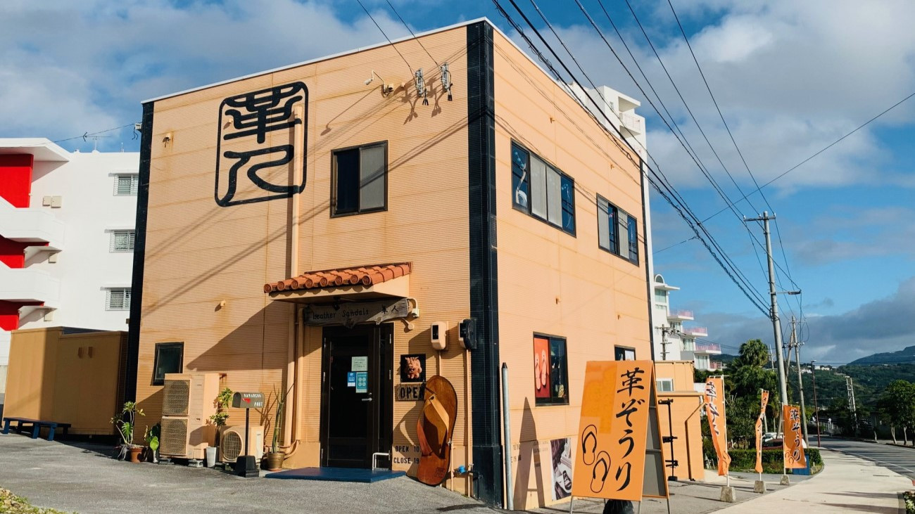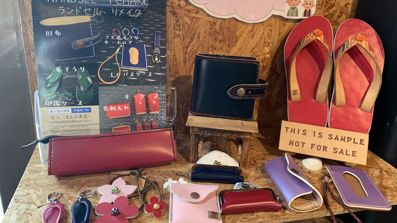 地元本部町の誇る「もとぶ牛」をはじめ、琉球藍で染めた牛革、エイ革・ヘビ革・クロコダイル革なども使用し、その場で、革ぞうりでをお作りもしております。