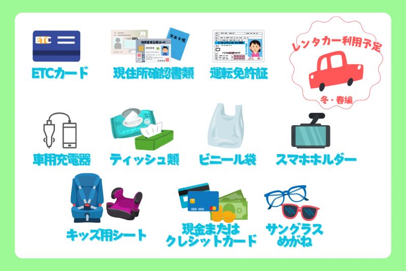 ※レンタカー会社によって、必要書類やお支払い方法(現金/クレジットカード)、貸出品(オプション)が異なりますので予めご確認ください。