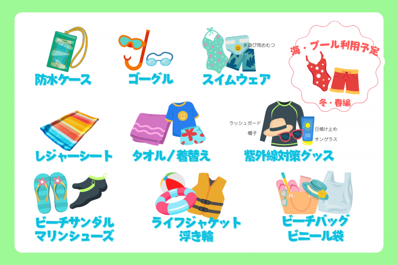 誤って足を怪我したりしないよう、ビーチサンダルやマリンシューズを用意しましょう。