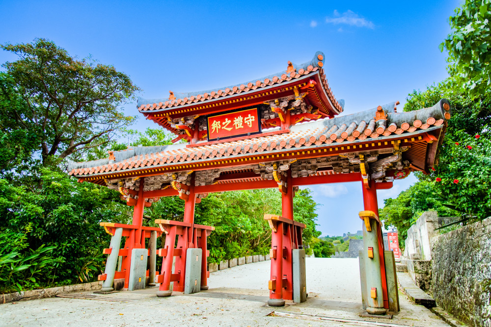 首里城(しゅりじょう)公園は、首里城正殿を中心とした有料区域と無料区域の城内、守礼門(しゅれいもん)や園比屋武御嶽石門(そのひゃんうたきいしもん)、円覚寺(えんかくじ)跡、弁財天堂(べざいてんどう)といった周辺文化財からなる公園です。