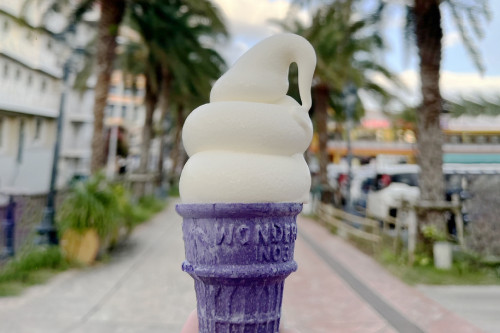 沖縄県産紅芋をつかった鮮やかな紫色のコーンは、沖縄旅に彩りを添えてくれること間違いなし!ソフトクリームの他にも、紅芋ちんすこうや紅芋アンダギーを添えたプレートなど、伝統菓子とのコラボレーションメニューも必食です。