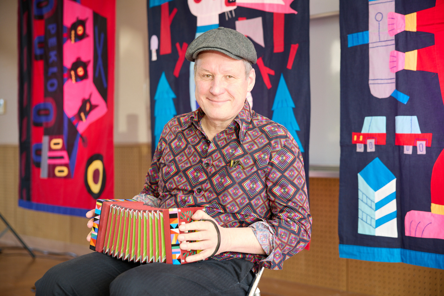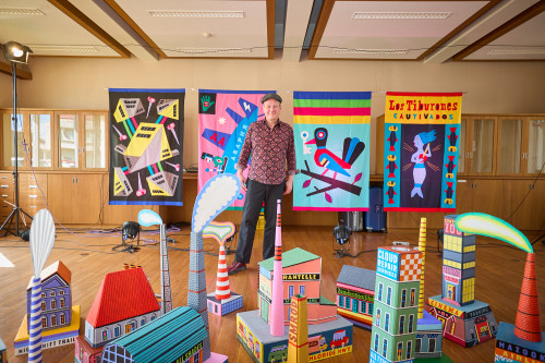 色鮮やかな作品が並ぶドイツ・ベルリンを拠点に活動するアーティスト、ヘニング・ヴァーゲンブレト氏の展示。普段、船や家の模型を制作する一方で音楽活動にも取り組み、今回の展示では立体作品と音楽を融合させた作品を披露。「旅するシアター(トラベリングシアター)」という異なる土地を訪れながら、作品を通して物語を紡ぎ出すコンセプトが作品に息づいています。