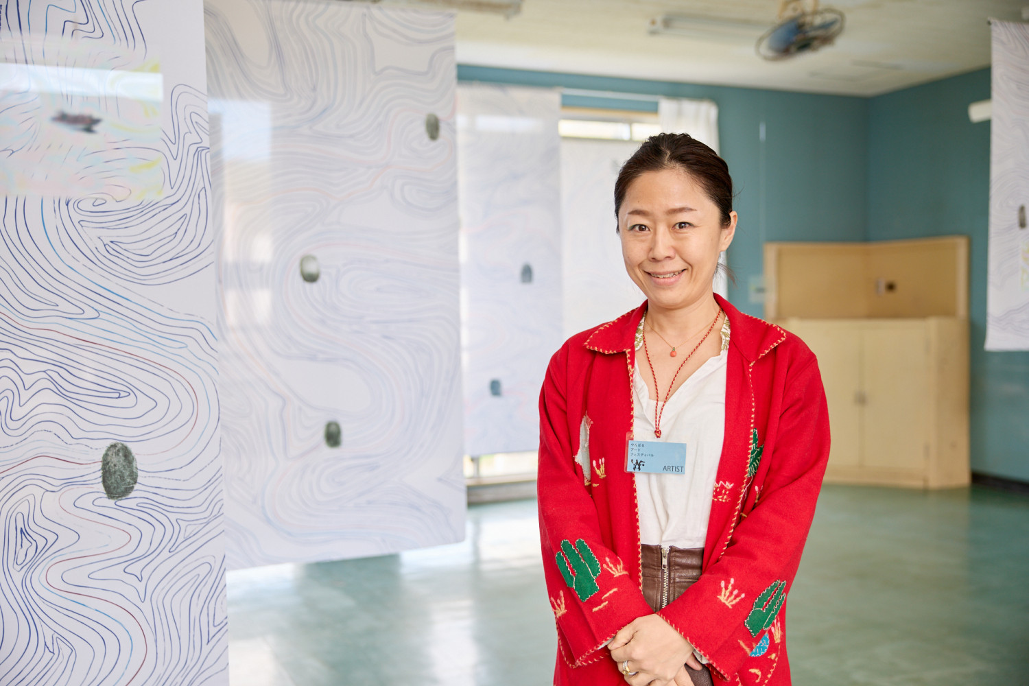 会場に掲げられた7枚のタペストリーに曲線を描き、実際の人々からもらった指紋をスタンプしたアーティスト・うしお氏。「海の向こう」をテーマに、移民とアイデンティティに思いを馳せる力強いメッセージが込められているんだとか。日系移民が外国人として差別され、IDカードに顔写真と指紋が押されていた過去にインスピレーションを受け、沖縄から世界各地に移民として渡ったウチナーンチュ(沖縄出身者)とその子孫たちに協力をお願いし集められた指紋が一つの作品として消化されている様子は必見です。