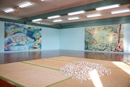227cm x 364cmの大型絵画2枚や、沖縄に滞在していた3ヶ月、毎日砂浜に足を運んで拾った貝殻などを展示したユニークな構成の作品『Seeing in the Dark』。貝殻の模様が山水画のように果てしなく広がり、貝殻、葉っぱ、海、そして山など自然と人間が織りなす壮大な景色へ繋がっていく様子をキャンバスへ抽象的に表現しています。