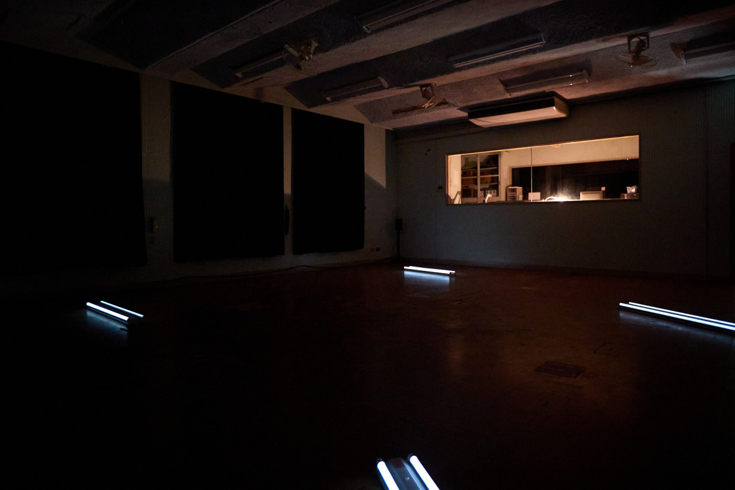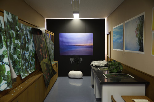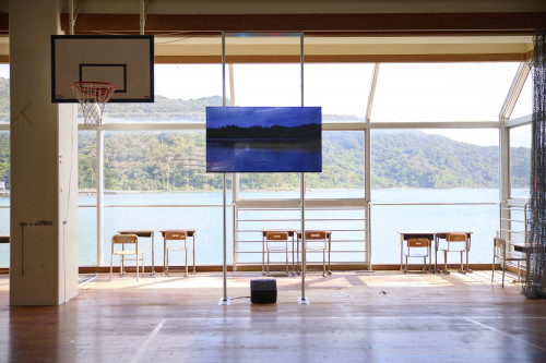 小学校の放送室と視聴覚室が展示会場となった冨安由真氏のインスタレーション作品『おとずれるもの』。「TERRADA ART AWARD 2023」を受賞し、その招待を受け展示に参加した冨安由真氏は、サウンドや映像、照明を巧みに組み合わせることで、沖縄の独特な信仰と儀礼を表現しました。塩屋湾の「ウンガミ」と呼ばれる行事を具現化したこちらの作品は、小太鼓(パーランクー)の音や海を空撮した映像、そしてウンガミの儀礼「御願バーリー」の掛け声を録音した音声などが見事に融合しています。