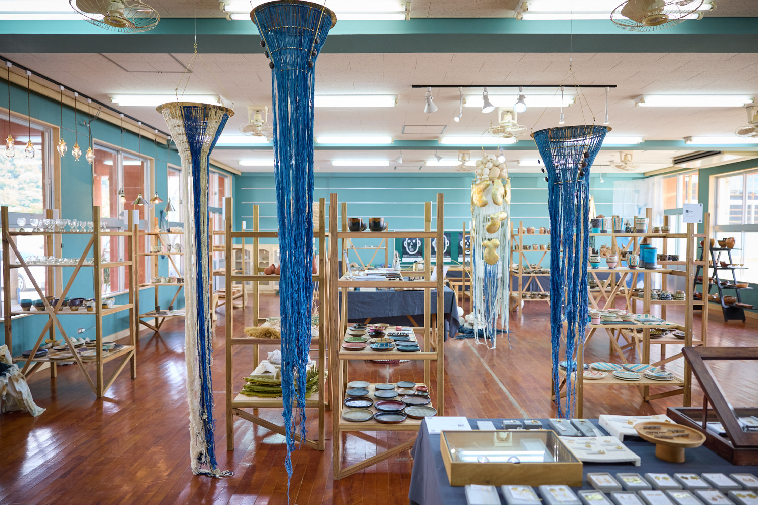 塩屋湾を一望する大宜味村立旧塩屋小学校の体育館は、今回のメイン会場となる旧塩屋小学校において、ひときわ目を惹くエリア。沖縄県で唯一残る手打ち鍛冶屋「池村鍛冶屋」をはじめ、八重山地域の創作や美術工芸をリサーチし、その魅力を広めるユニット「五風十雨」、海が見える立地を生かした展示などが複数設置されています。