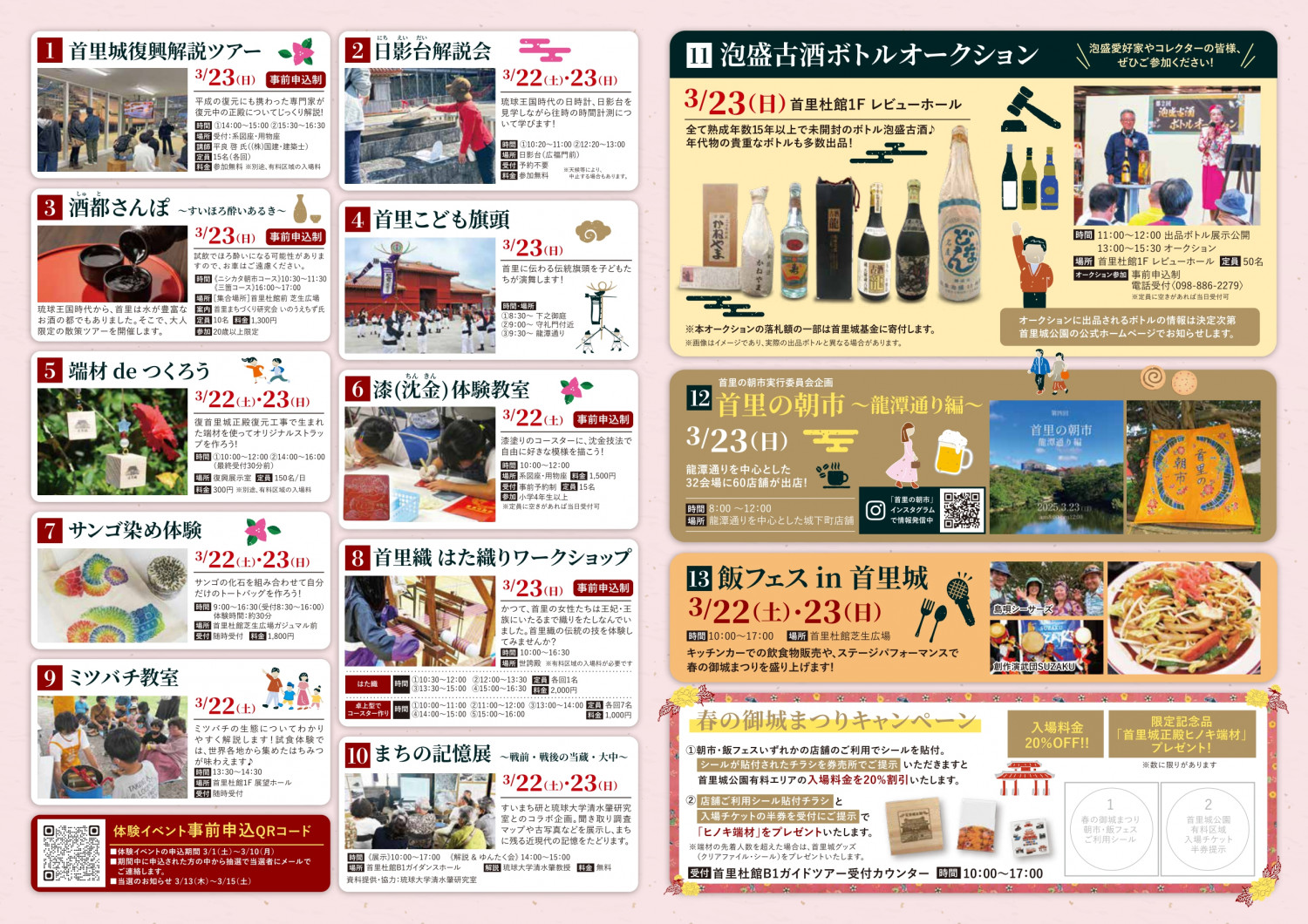 大人から子どもまで楽しめるワークショップ、龍潭通りで開催される朝市など、春の首里城や周辺地域を楽しんでみてはいかがでしょうか。