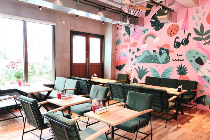 ハワイでアイランドスタイルBBQを意味する「HIBACHI」のプレートメニューを中心に、ハワイ定番のガーリックシュリンプやロコモコ・ポキなどの他、アグー豚や沖縄県産カジキなど、地元食材が楽しめるBBQメニューも揃っています。また、内壁の一部と店外のフェンスはハワイ在住のアーティストが描いており、インスタ映えすること間違いなし。