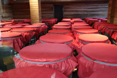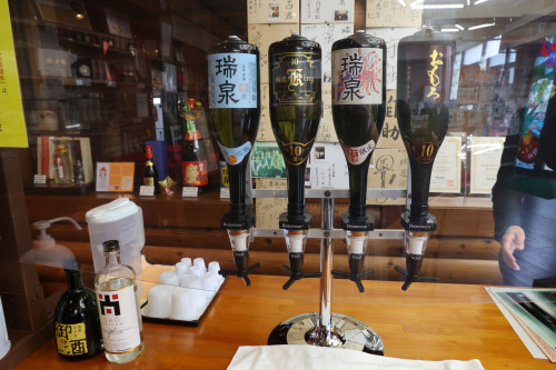 瑞泉酒造は、ゆっくり時間をかけて3年以上熟成させた泡盛の古酒にこだわりを持ち、長いと数十年も経過した古酒もあります。古酒に若い酒を注ぎ足す「仕次」という方法で、年月を重ねるほどにまろやかで芳醇な味わいになるといい、蔵内には年代物の大きな甕がずらりと並んでいました。