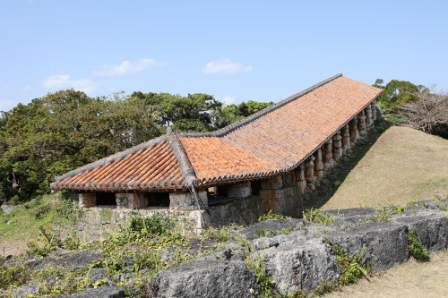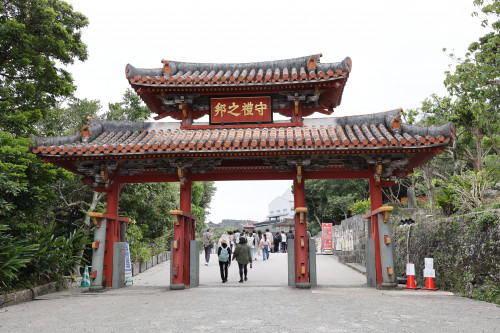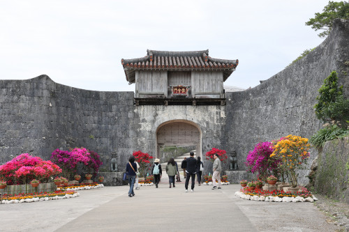 首里城といえばの赤が目印の「守礼門」をくぐり、ゆるやかな坂道を登りながら城壁や複数の門を通り抜けていきます。随所に中国と日本の影響を受けているという独特の建造物に、異国情緒を感じてわくわく。ハイビスカスなどの長野では見かけないカラフルな花々もきれいに手入れされ、冬でも花が咲いていることにも驚きます。広福門の手前あたりはビュースポットとなっており、市街地や遠くに東シナ海も望めました。