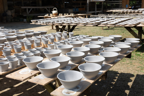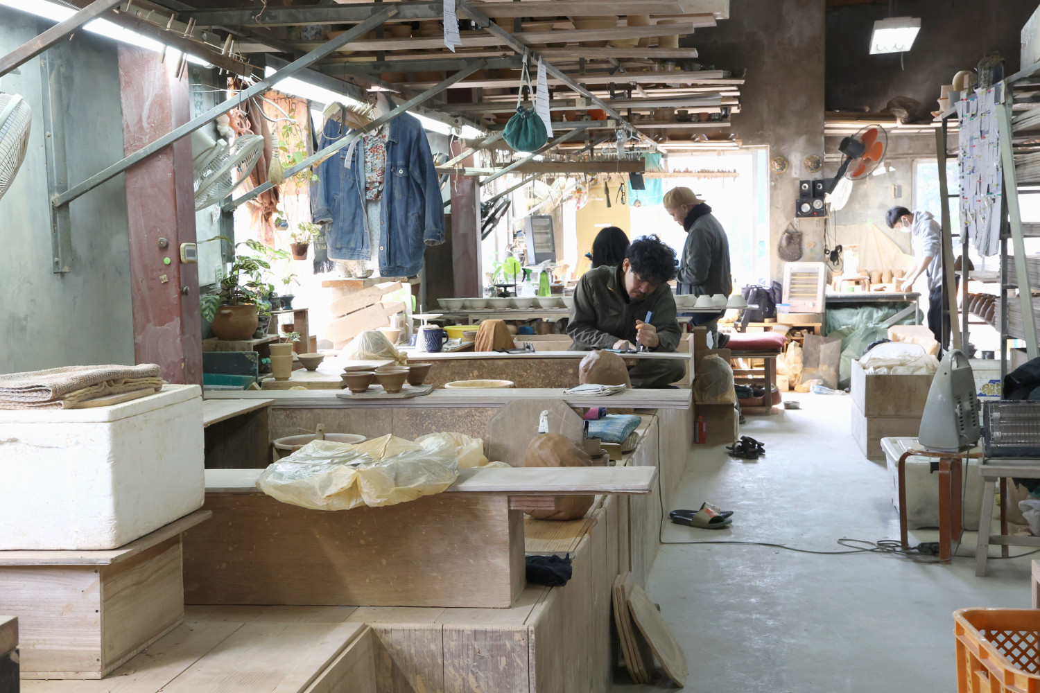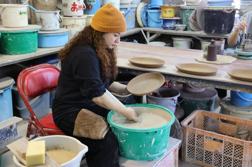 体験後、工房を見学させてもらいました。20以上の工程があり、分業制でそれぞれが自分の仕事に真摯に取り組んでいます。ロクロでさまざまな器の形を作る人、絵付けをする人、化粧掛けをする人、釉薬をかける人など。そして週に2回の窯焼きを経て、ようやく完成します。