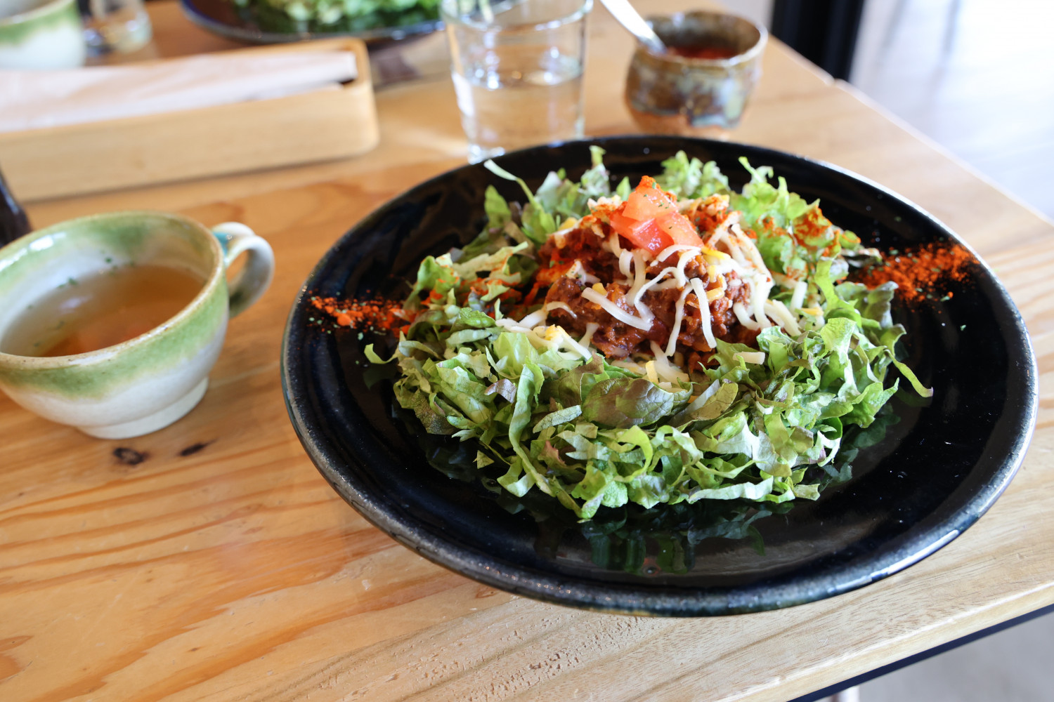 いくつかあるランチメニューの中で、沖縄といえばのタコライスをチョイス。ごはんの上には、スパイスで濃いめに味付けしたひき肉(タコミート)とレタスがどっさり。 黒い器に緑や赤が映えます。伝統的かつモダンでおしゃれな空間の中、この地で生まれた器で料理を味わう。その喜びを噛み締めながら、最後までおいしくいただきました。