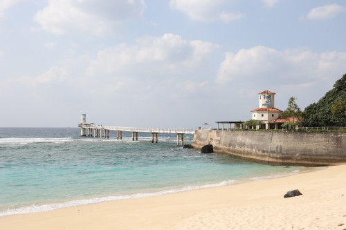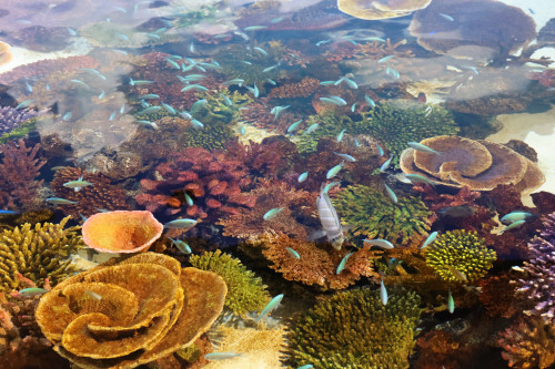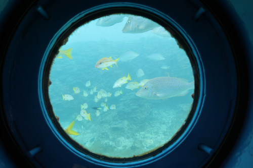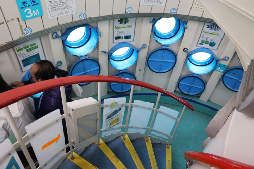 冬のオフシーズンなので人も多くはなく、ゆったりと海岸を歩きながら海中展望塔へ。螺旋階段を降りていくと、水深約3メートルの海中の世界へ辿り着き、24面の窓から珊瑚礁や色鮮やかな魚たちを間近に観察できます。