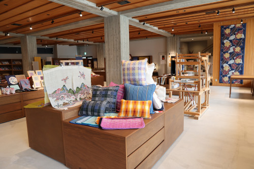 1階は作品のギャラリーやショップ、2階は琉球びんがたの作業室、3階は首里織の作業室。