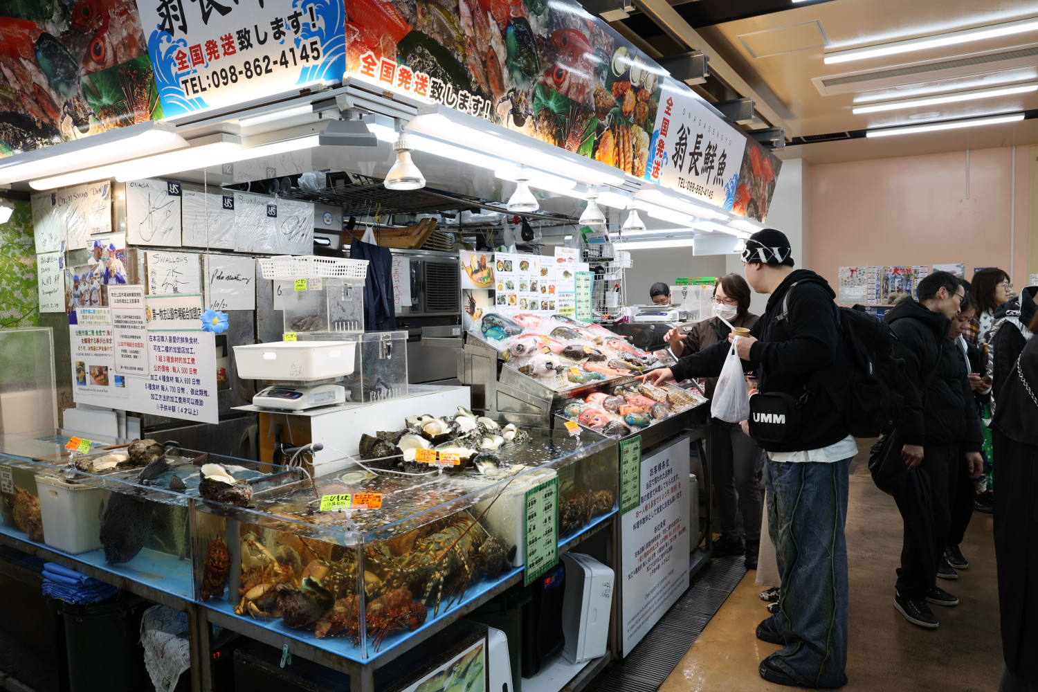 市民の台所でもある「那覇市第一牧志公設市場」は、精肉店や鮮魚店がひしめき、2階には飲食店も。沖縄県外では見たことのない見た目の魚や貝の姿に、思わず驚愕。その場で買って食べることもできるので、どんな味がするのだろうと気になりながらも、勇気が出ず、また来た時にリベンジを誓うのでした。