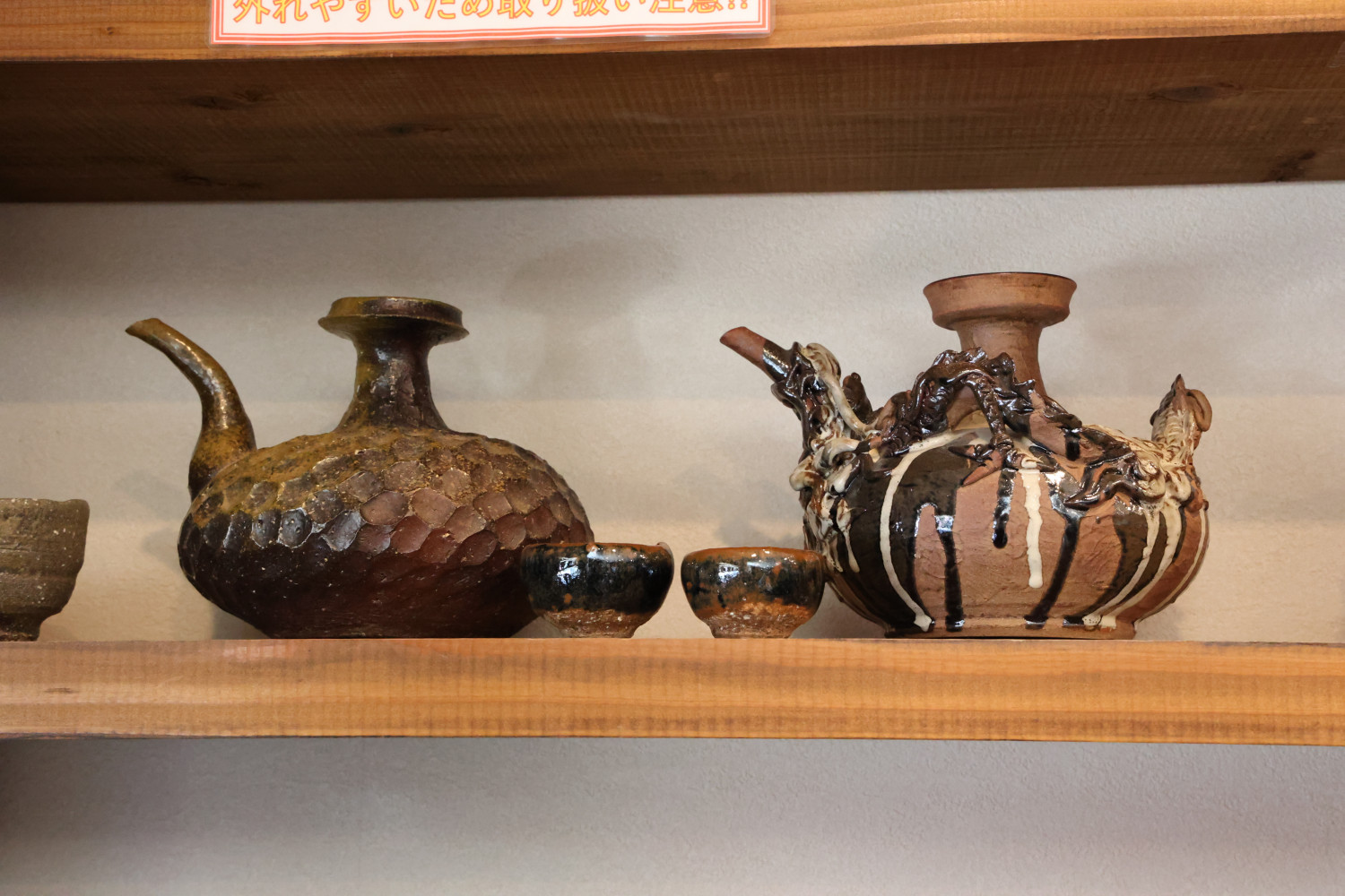 そして沖縄ならではの器も発見。酒壺です。地元の人はここに泡盛を入れて、結婚や退職などのお祝いに贈る習慣があるそう。初めて見たので、びっくり!また「カラカラ」という泡盛を飲むための酒器もありました。酒壺から掬った泡盛をカラカラに入れて、そこから泡盛を飲むそうで、日本酒でいう徳利です。