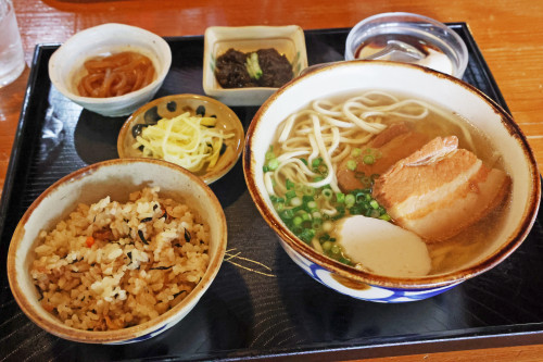 「三枚肉そば」のセットメニューを注文。三枚肉そば、ジューシー(炊き込みごはん)、もずく酢、しょうが、ジーマーミ豆腐などがセットになっています。コシのある麺と分厚くてほろほろと柔らかい三枚肉が、深いコクのあるスープと絡み合い、たまりません…!沖縄そばと一緒に出ることが多いというジューシーも初めて食べましたが、具沢山で風味豊か。ボリュームも満点で、心もおなかも満たされました。