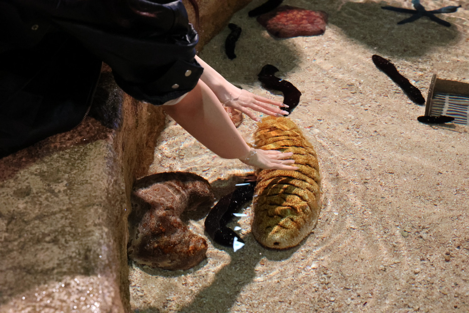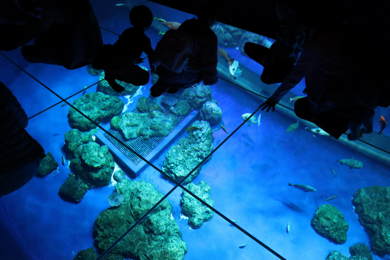 最新の映像表現と空間演出を駆使して、海の上を歩いているようなエリアがあったり、現実の時間帯に合わせて変化する沖縄の海を再現したような場所があったりと、優雅に泳ぐ海の生き物たちを眺めながら、幻想的な空間に癒されます。ペンギンや海水魚などへの餌やりなど、生き物と触れ合える体験もありました。