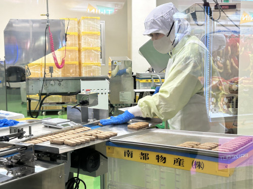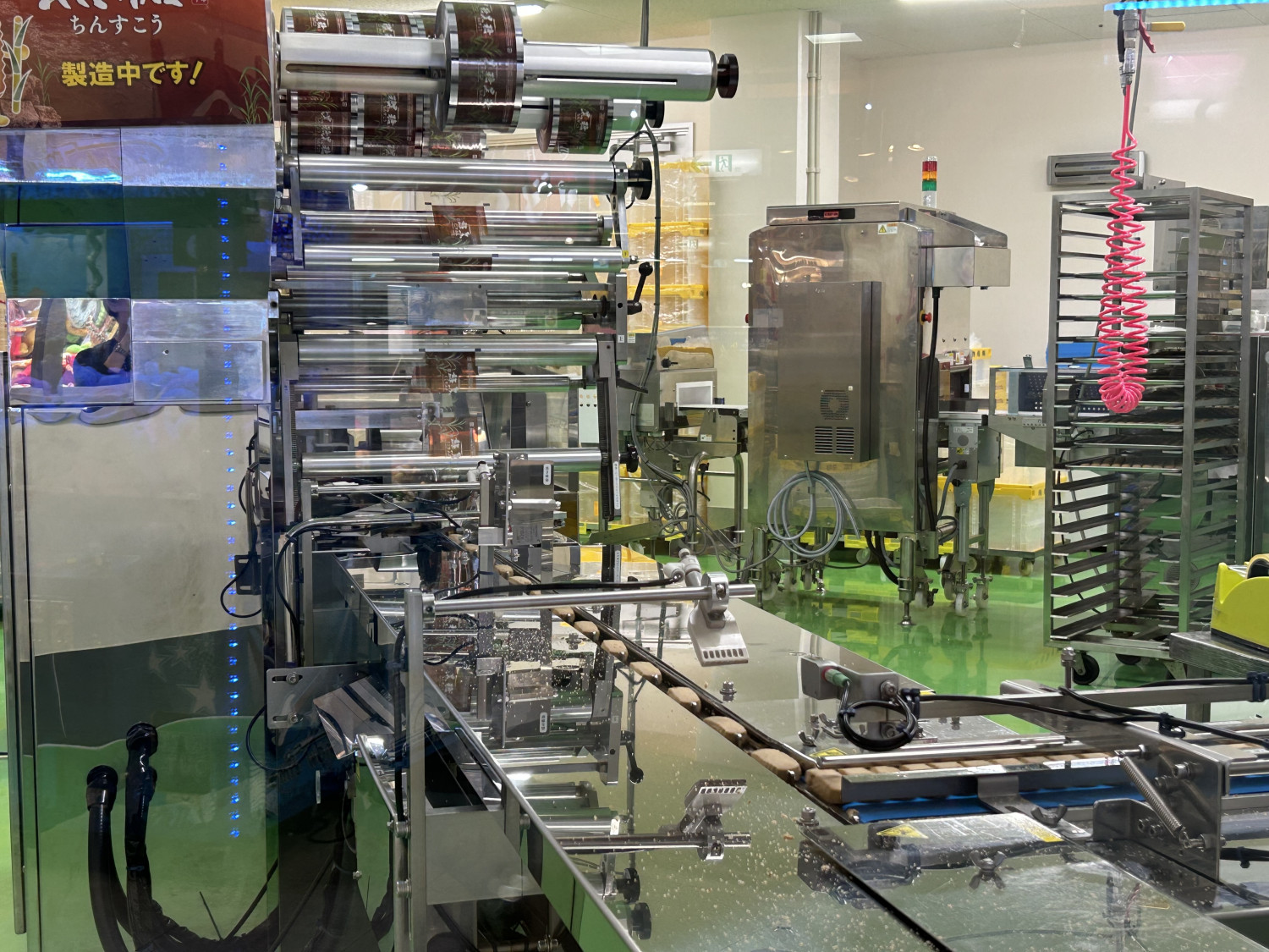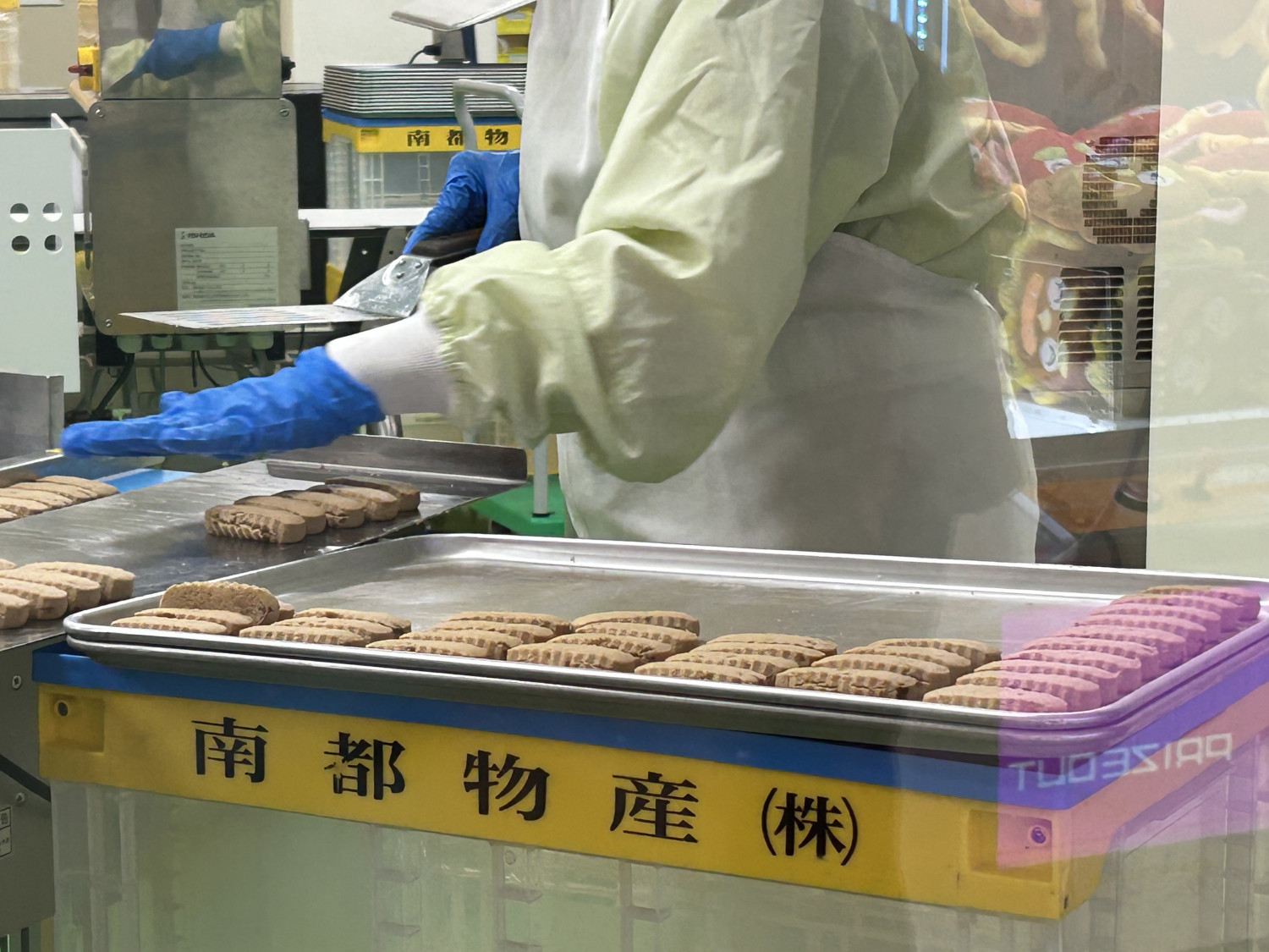 おきなわワールド「おみやげ専門店街」には、ガラス張りの菓子製造工場があり、主にちんすこうの製造をしています。どんどん出来上がっていく、ちんすこうに目が釘付け☆甘い香りに包まれて、ハッピーな気分になります!
