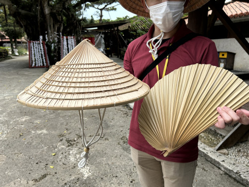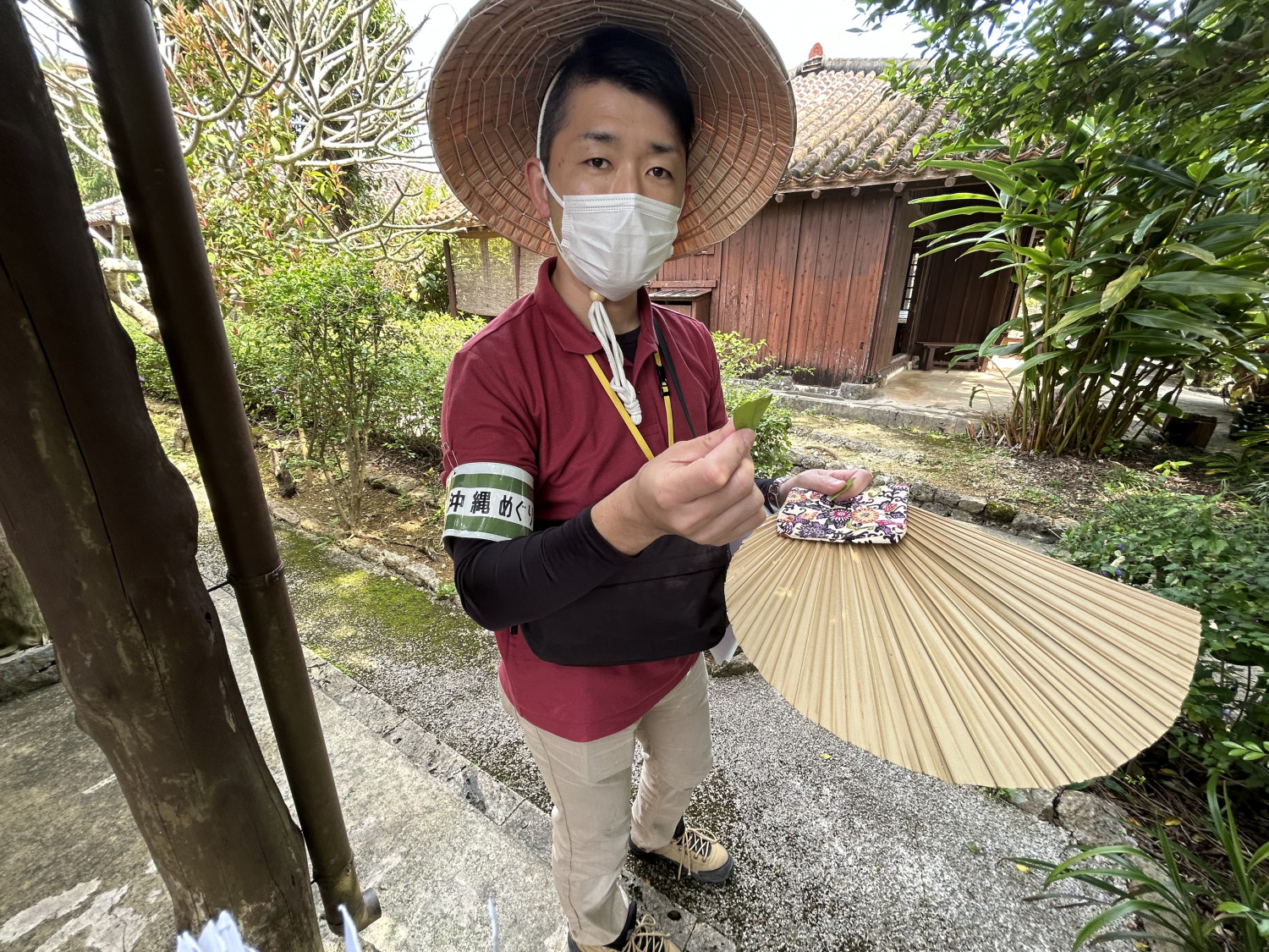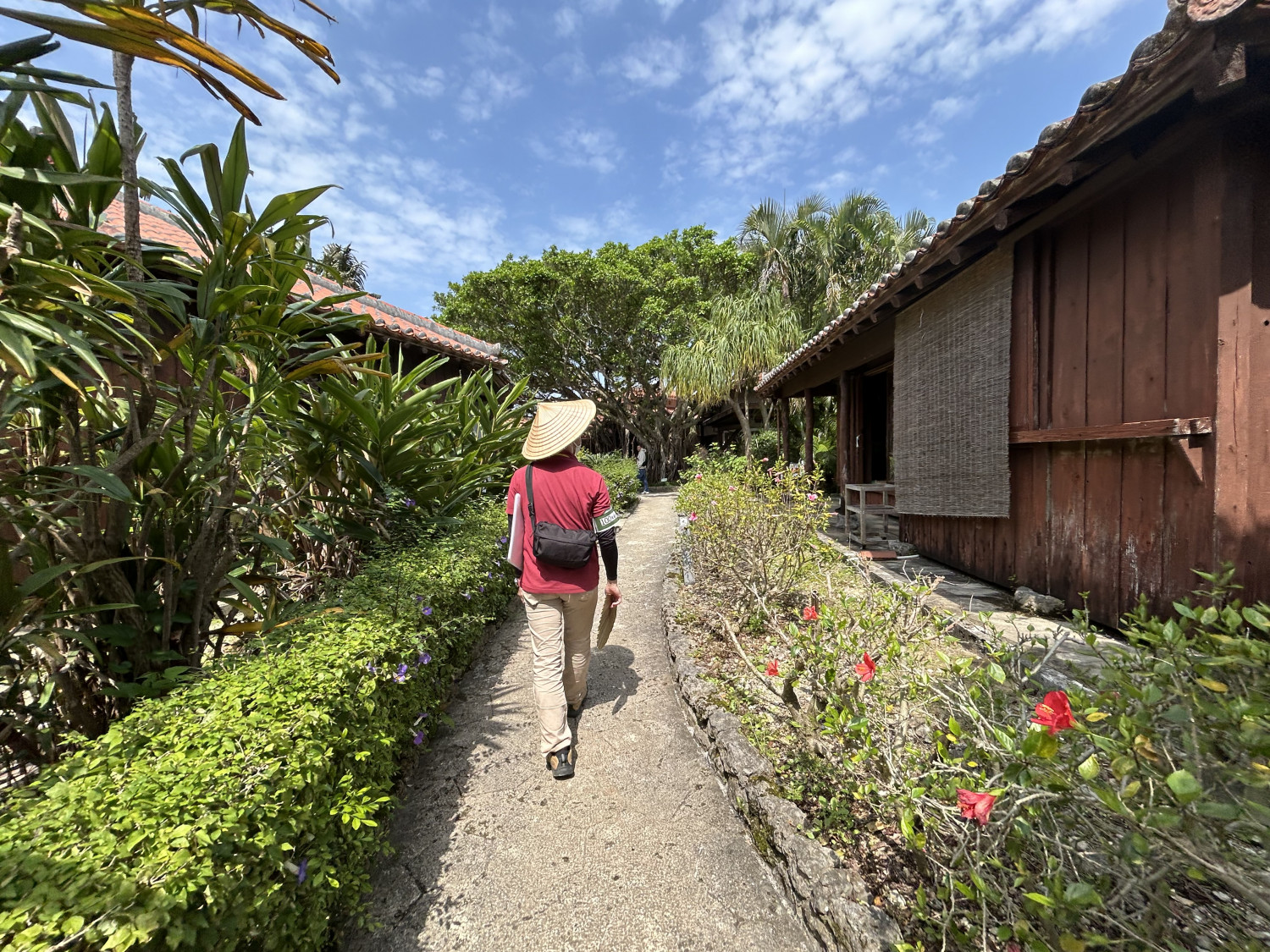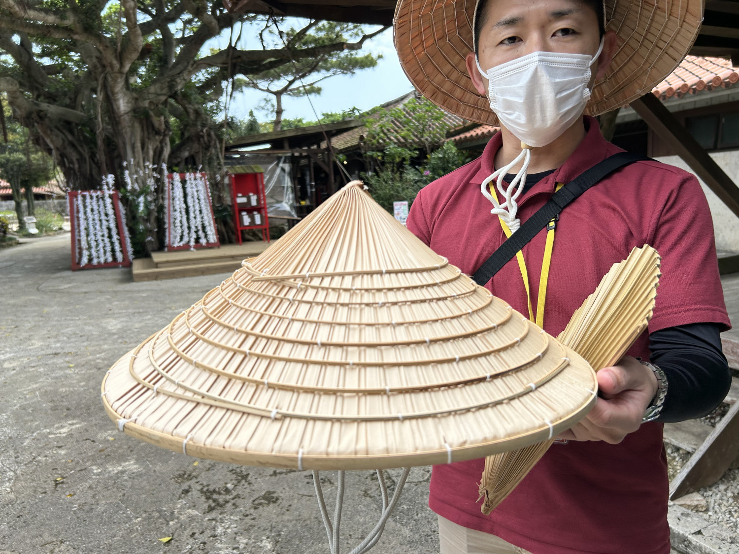 最初にクバ笠(帽子)を被ります。日差しの強い沖縄では、畑仕事や釣りをしている人が被っているのを見かける、このクバ笠。「一瞬被って、写真撮影して終わり」ではなく、実際に被って集落を歩いてみる・・・。笠越しに見える風景は、一気に100年前の沖縄にタイムスリップしたような気分になります。