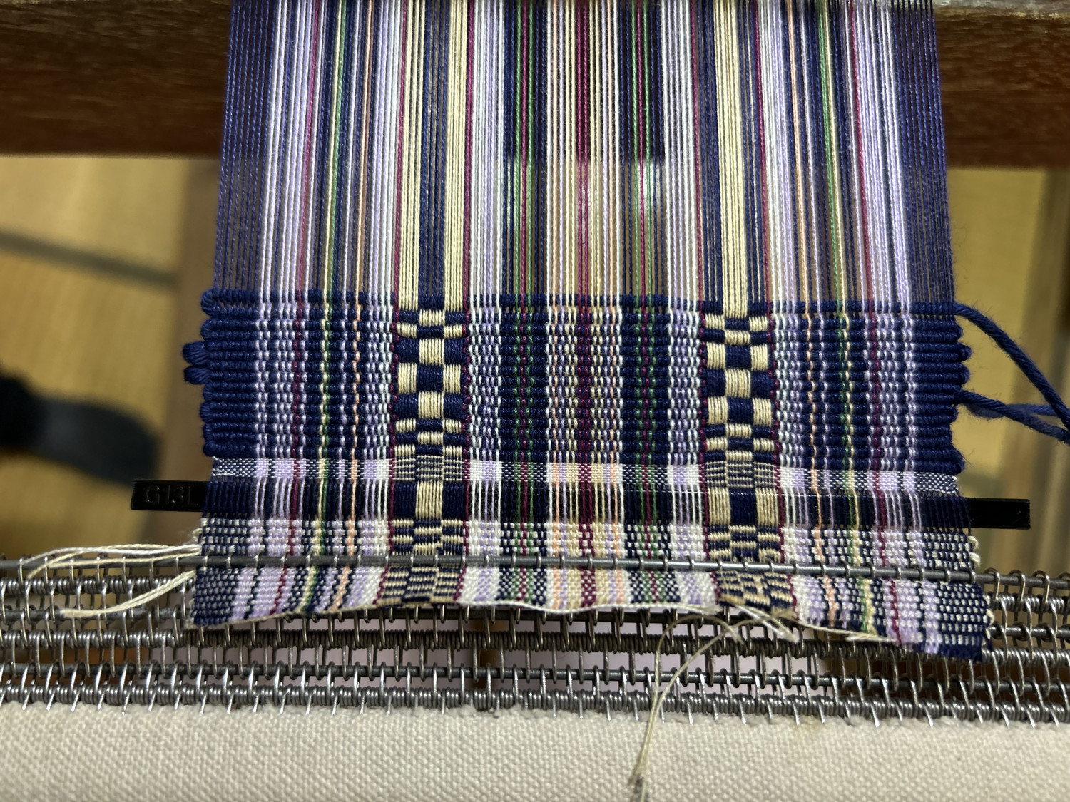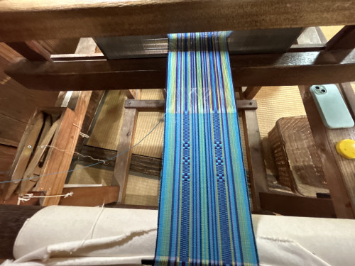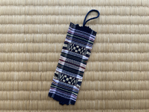 機織り機には横幅約10cm、およそ200本の経糸(たていと)がセットされ、横糸を左右に通していくとミンサー柄が織りあがっていきます。布に織り込まれる四つや五つの四角の模様には、「いつ(五)の世(四)までもお幸せに」という意味が込められていると言われています。大切な人を思って機織り―――とってもおすすめです!