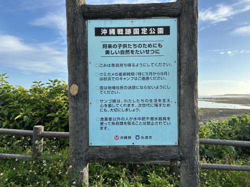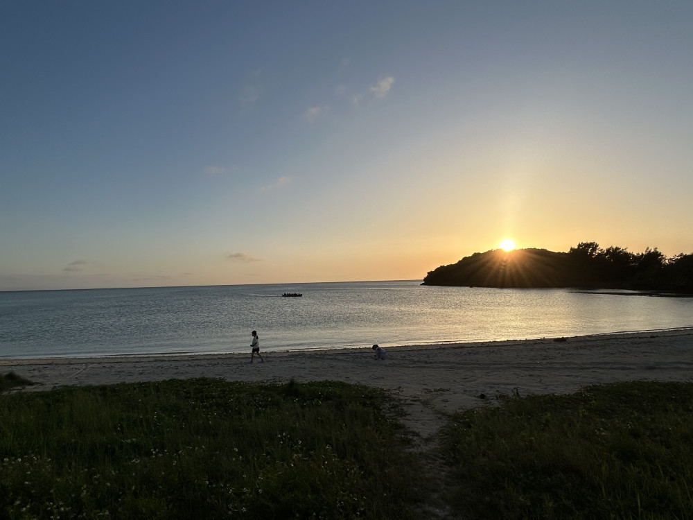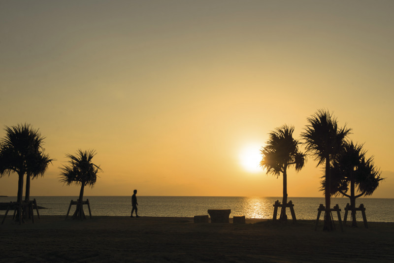 糸満の農道を抜けた先に広がる自然のビーチ。ハーレーの練習をしている船や、のんびり、ゆんたく(おしゃべり)している市民、夕日を眺めるカップルの姿も。