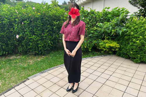 かりゆしウェアとヘアアクセの色合わせがGOOD。洗練された印象に。