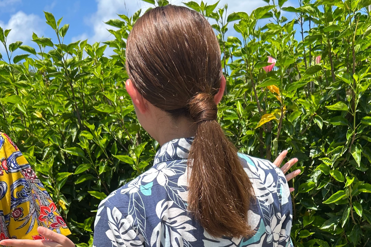 綺麗にまとめられた髪と、かりゆしウェアの相性は抜群。清潔感のある着こなしに。