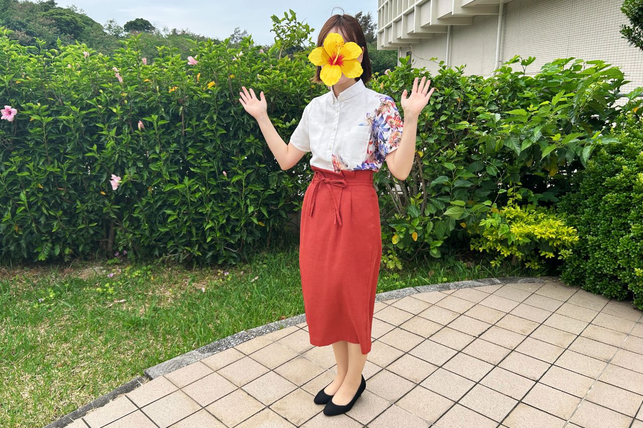 タイトスカートを合わせたフェミニンな着こなしや、シックなかりゆしに品のあるアクセサリーを添えたスタイル。きれいにまとめたヘアスタイルが、かりゆしウェアの洗練度を高めます。