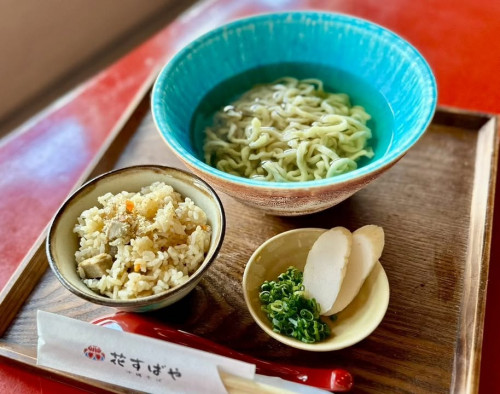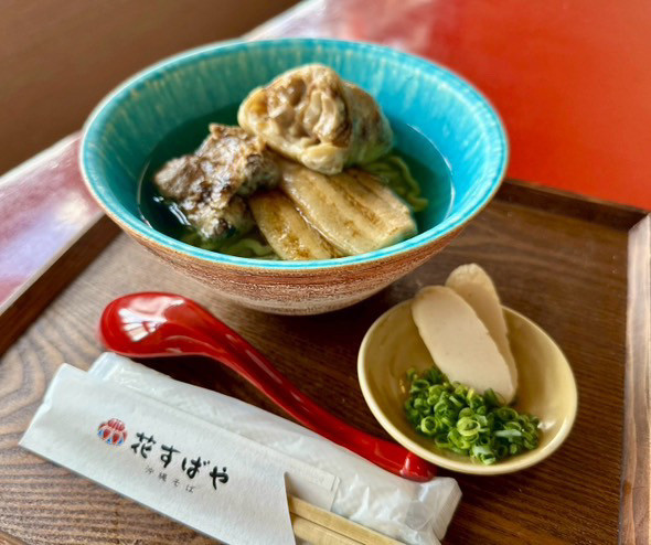 4月1日那覇市安里にオープンした「花すばや」。昼はそば専門店、夜はしゃぶしゃぶ店の「安里家」として営業しており、スタイリッシュで落ち着いた空間の中で、こだわりの"淡麗スープ"と高加水率麺ならではの"もちもち"食感が特徴の『ちぢれ太麺』が相性抜群な沖縄そばがいただけます。炙り本ソーキそばや、炙りてびちそば、ゆしどうふそば、三枚肉がのった沖縄そばなどメニューも豊富で、厳選した県産の豚肉と野菜をたっぷり使用した沖縄の炊き込みご飯「ジューシー」や、沖縄そばとジューシーがセットになった「こどもそばセット」もあるのでお子様連れの方にもぴったりです。
