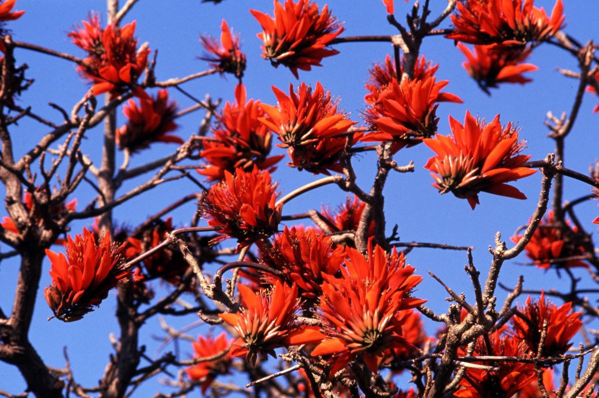 沖縄の南国イメージを華やかに彩るのが、島の各地で咲き誇る花々です。中でも沖縄を象徴する花が「デイゴ」。1972年の沖縄本土復帰県の年に、県花に指定されており、春から初夏にかけて赤い花を咲かせます。沖縄では「デイゴが咲き乱れる年は台風が多い」と言われています。