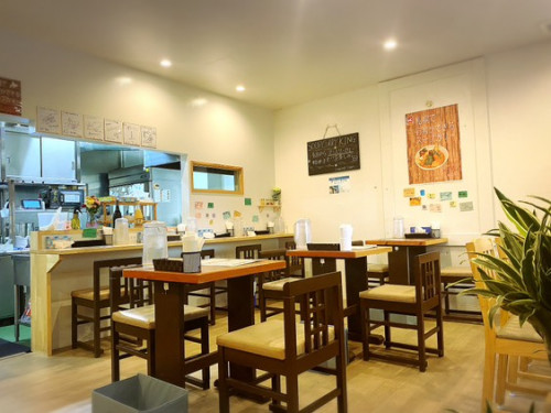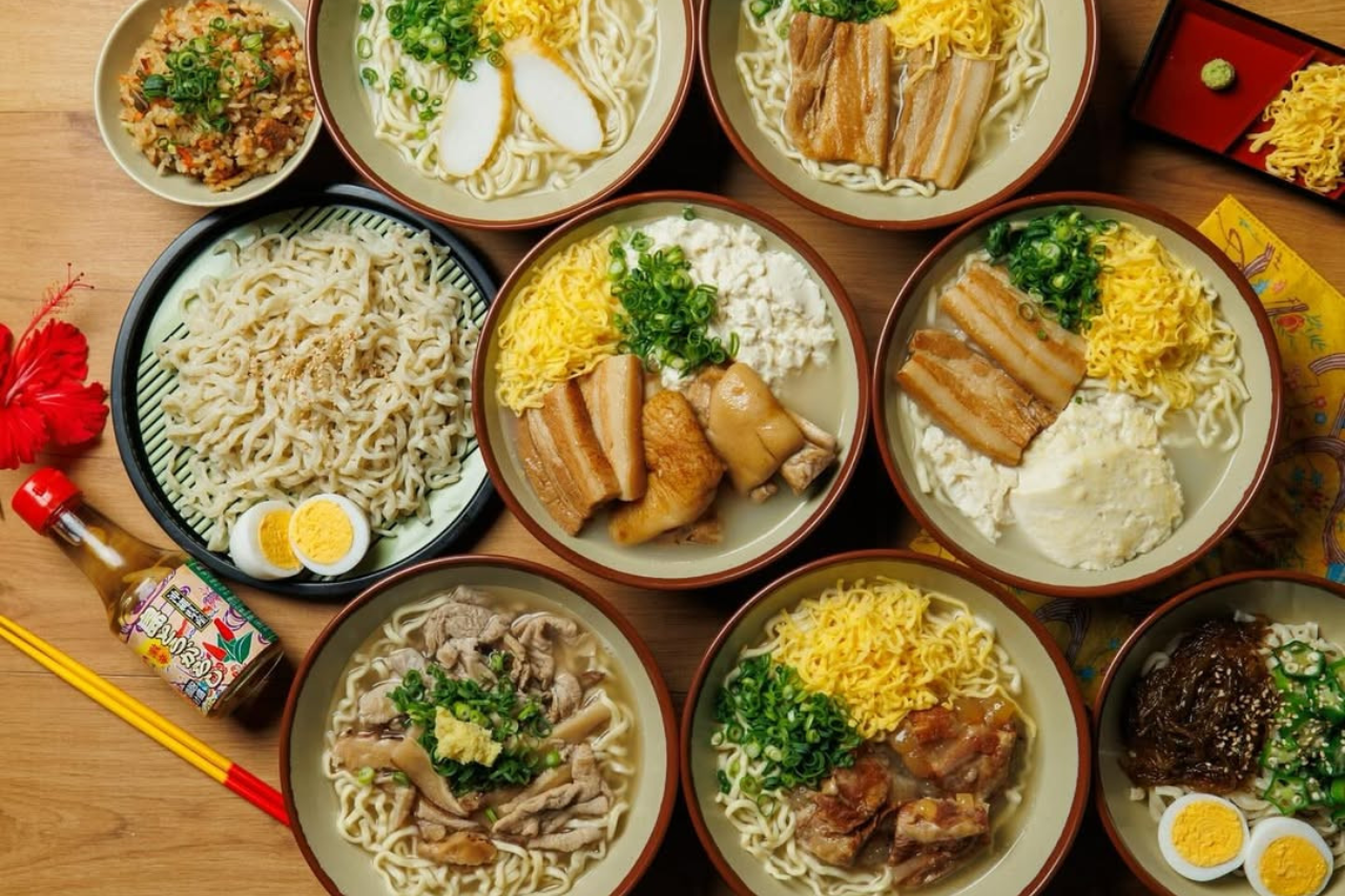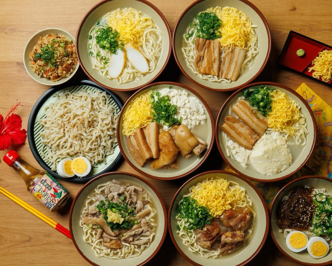 6月にうるま市みどり町にオープンした、「おきなわすばやぁ太陽 みどり町店」。製麺所を併設し、こだわりの自家製麺を使用しています。スープはかつお出汁と豚骨出汁から選べ、好みに合わせた一杯を楽しめます。人気の「全部乗せそば」には、テビチ・三枚肉・ソーキ・志林川豆腐が入り、ボリューム満点。店内はお一人様でもくつろげる空間があり、人目を気にせずゆっくりと沖縄そばを味わえるのも魅力です。