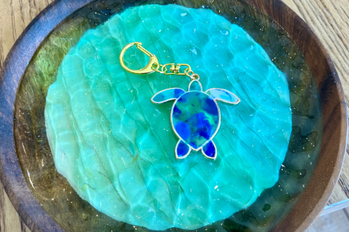 表と裏で違った色合いや表情を見せてくれる、世界にひとつだけのキーホルダー。「おきなわ物語」編集部に持ち帰ると、「可愛い!」とみんなに大好評でした。きっと、こんな素敵なキーホルダーを鞄に付けていたら、「それ、可愛いね!どこで買ったの?」と声をかけられることがあるでしょう。