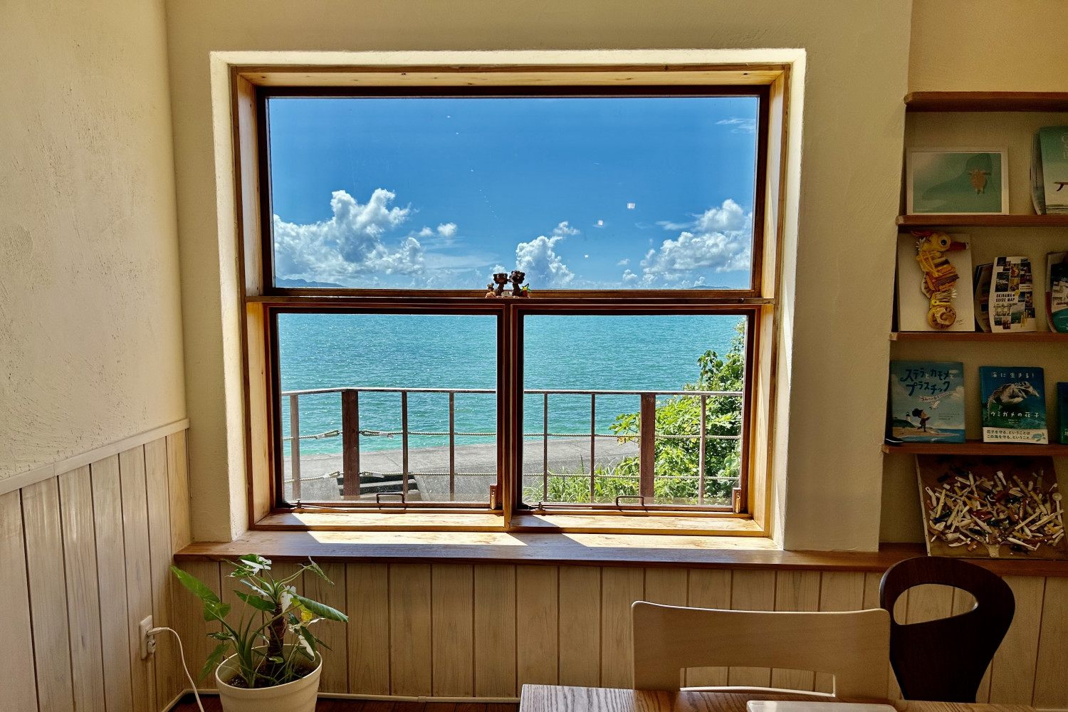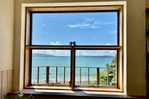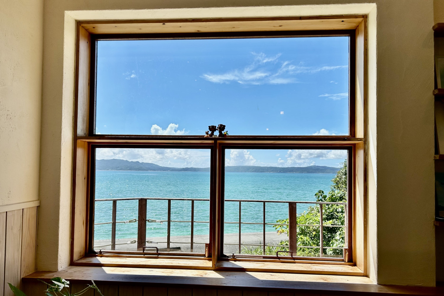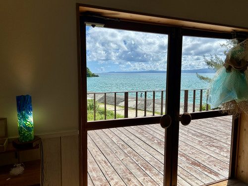 工房の奥にある大きな木枠の窓からは、古宇利島の海がエメラルドグリーンに輝いています。写真では到底伝えきれない、透き通るような美しさが目の前に広がっていました。