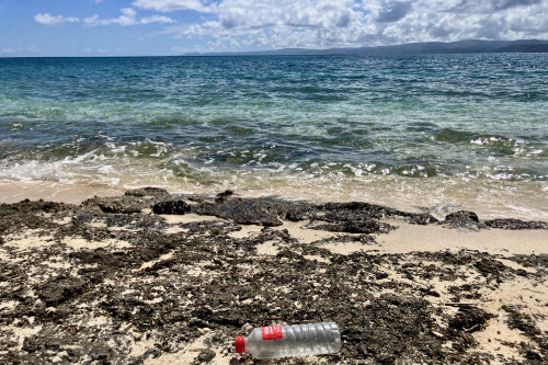 古宇利島の輝く海のそばに、ぽつぽつと落ちているごみたち。玉村さんによると、ごみで一番多いのはペットボトルとのこと。この日、多く見つけられたのは、やはりペットボトル、次いで缶類、プラスチックの破片、ビニール袋でした。