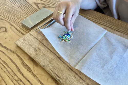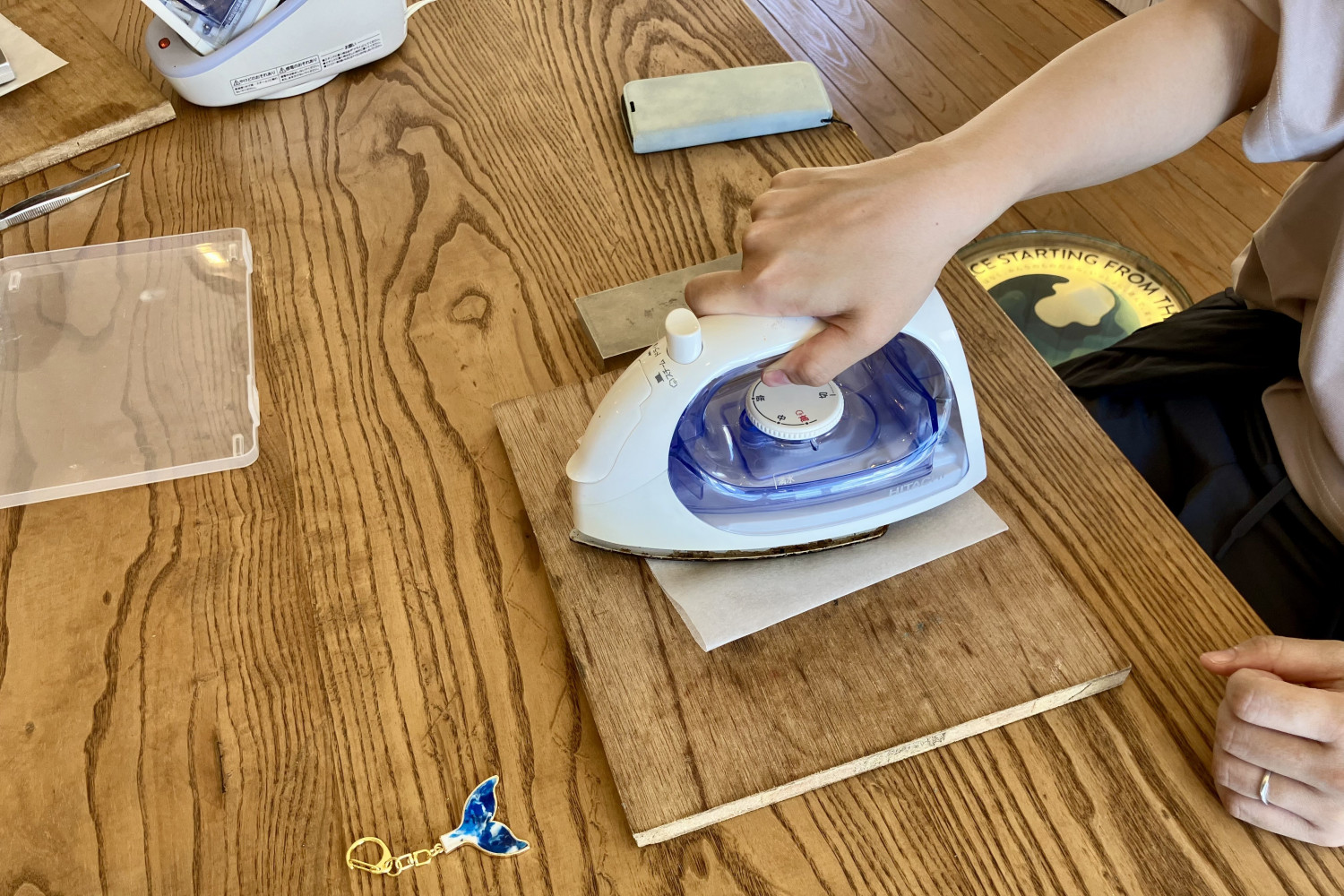 色とりどりの海洋プラスチック片の中から、好きな色や形を自由に選び、型に入れていきます。30秒ほどアイロンの熱でプラスチックをじんわりと溶かし、また空いた部分に新たな素材を加えていく――そんな工程を繰り返します。