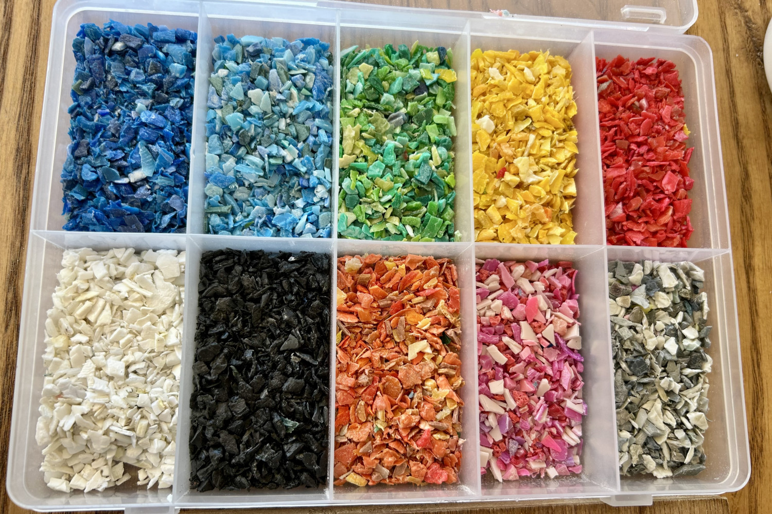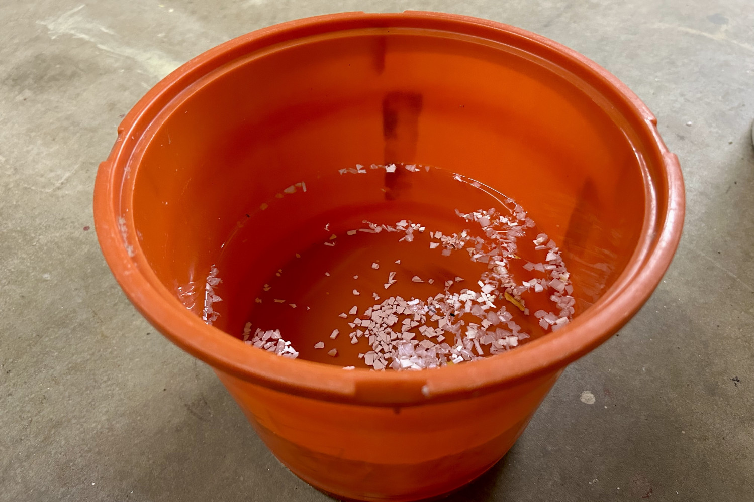 確認の方法としては、粉砕したプラスチック片を水を張ったバケツに入れ、浮かぶものは加熱可能、沈むものは加熱不可と判別します。加熱できない素材も、形や色を活かして、そのままアクセサリーづくりに使われているとのことでした。