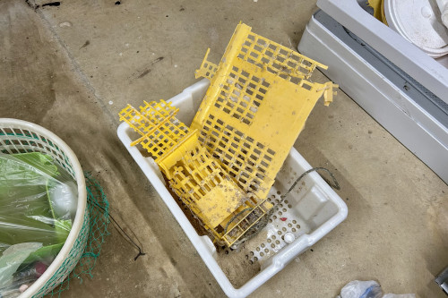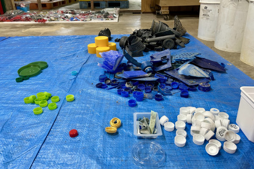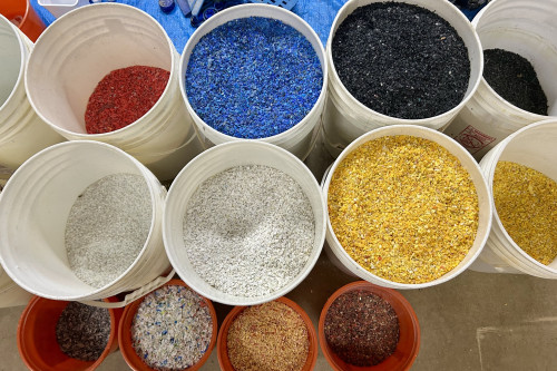 今回は特別に、回収した素材をアップサイクル(捨てられるはずだったものに新たな価値をつけて、別の製品に生まれ変わらせること)に使うため、洗浄・分別・粉砕を行う作業場も見せていただきました。