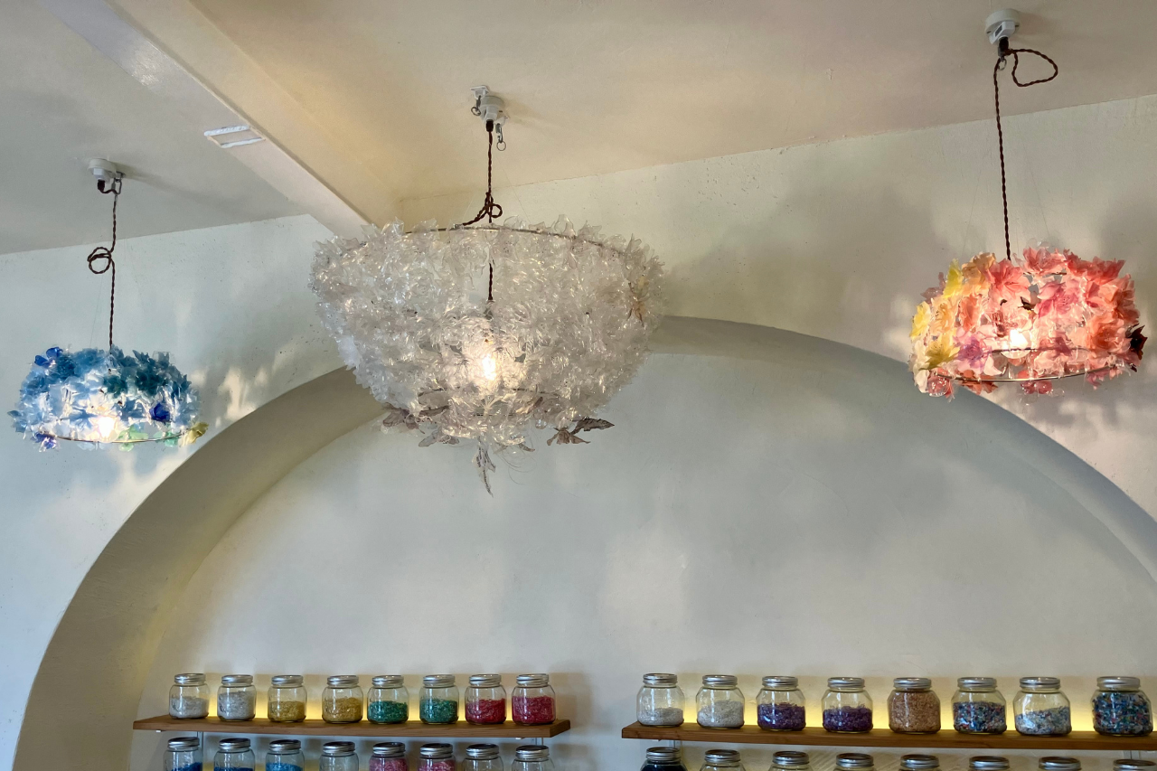 まず目に飛び込んできたのは、キラキラと輝く大きなシャンデリア。聞けば、捨てられていたペットボトルで作られたそう!
