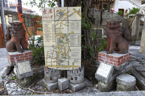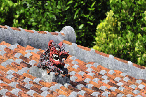 沖縄の伝統的な家屋は台風対策のため、家の周囲が珊瑚や石灰岩などを積んだ石垣で囲まれており、屋根の赤瓦も漆喰でしっかりと固められています。門には扉がなく、代わりに門の奥に「ヒンプン」と呼ばれる目隠しの塀が配置されています。これは風の直撃を防ぐのと同時に、目隠しの役目を果たしています。