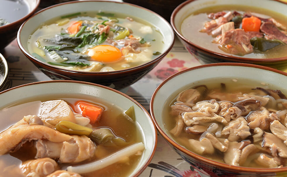 また、沖縄は汁物の種類も豊富です。豚の内臓を使った中身汁、豚肉を入れた白味噌仕立てのイナムドゥチ、豚足たっぷりのてびち汁などに加え、固める前の島豆腐を使ったゆし豆腐、具だくさんの味噌汁、真っ黒なイカスミ汁なども、沖縄ならではの汁物といえます。