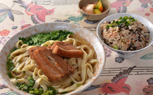 そんな中からまず紹介したいのは「沖縄そば」。そばといってもそば粉は使われておらず、小麦粉で作られた麺を用い、カツオダシや豚ダシの汁に、甘辛く煮た豚肉とカマボコをのせたものが基本です。