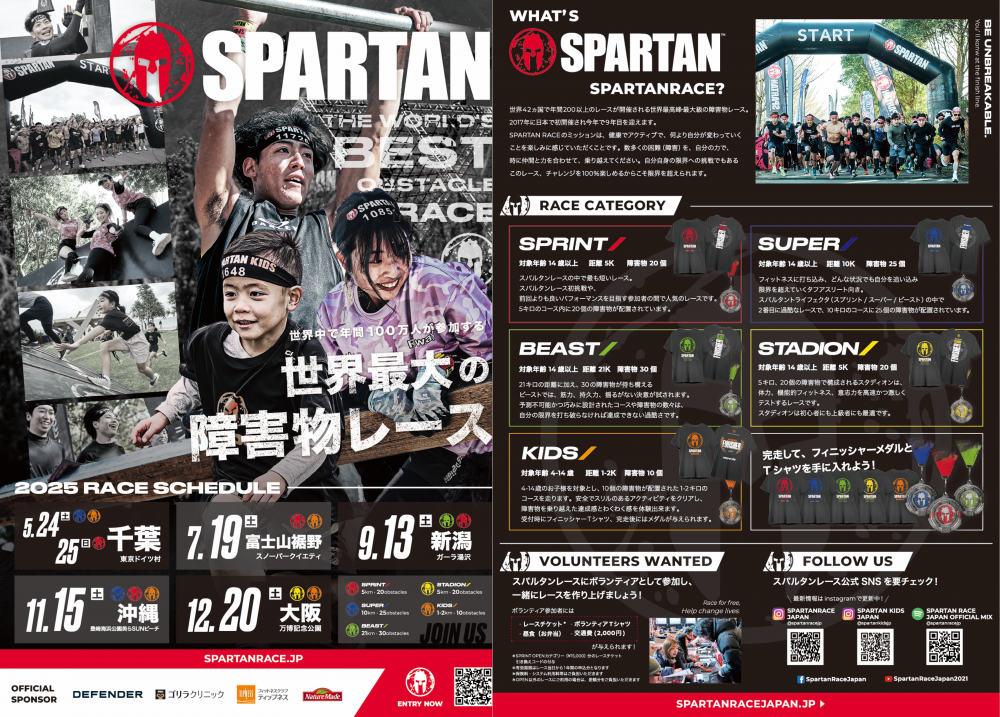 スパルタンレースは、世界40か国以上・年間170以上の大会が行われている世界最高峰の障害物レース。日本では2017年の初開催以来、全国各地で開催されており、エリートアスリートから初心者、親子まで楽しめる誰でも挑戦できるレースとして年々人気が高まっています。