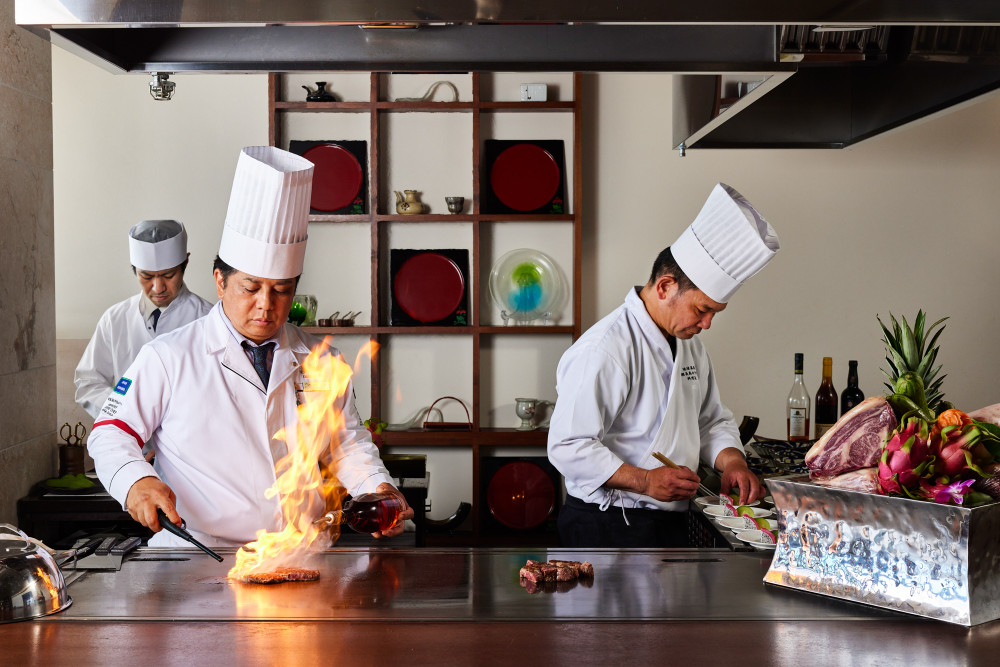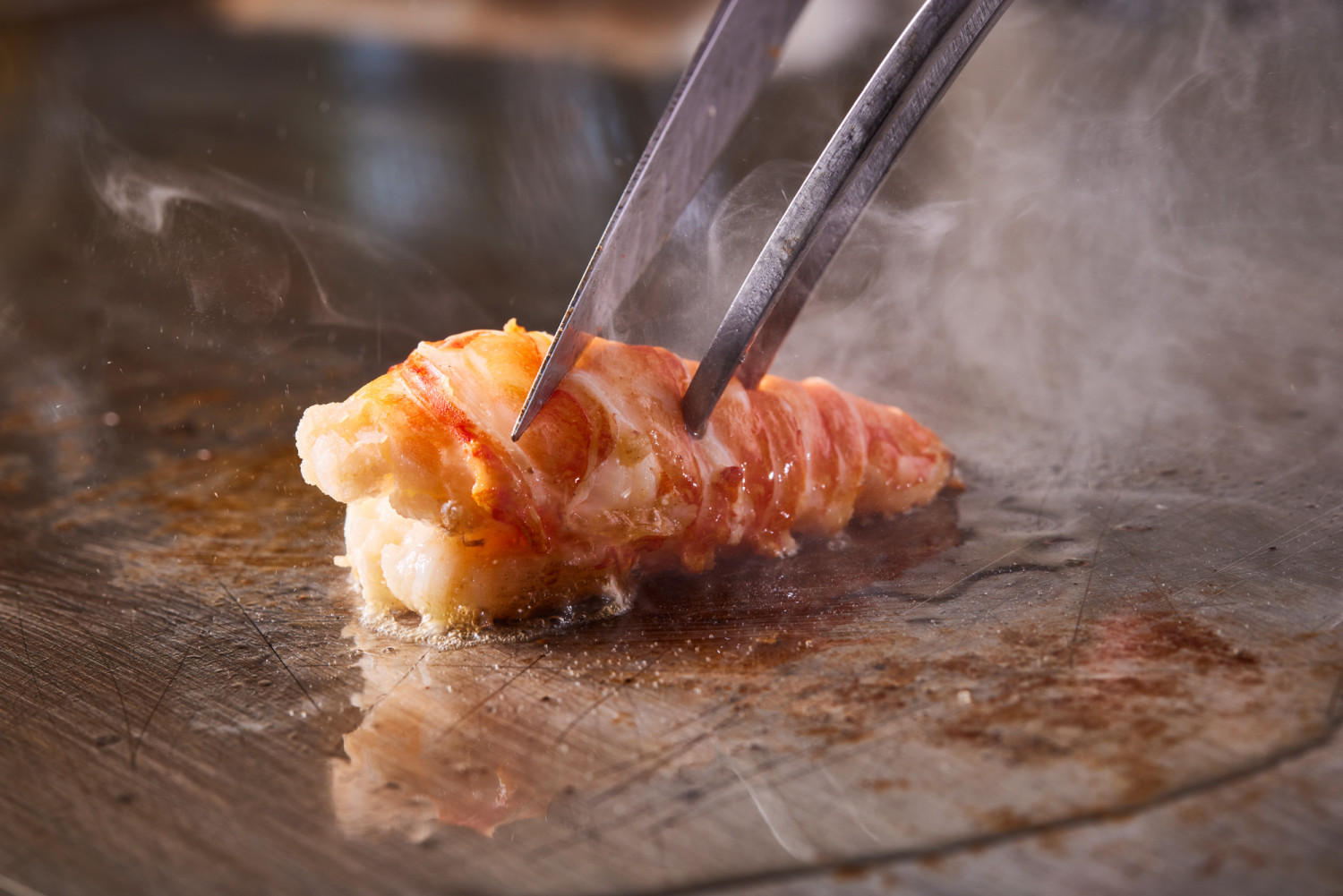 目の前で調理を行うライブキッチンでは、香ばしい香りと音、出来たての美味しさをその場で楽しめる鉄板焼き料理が楽しめます。ディナーの鉄板焼きコースで使用する厚さ5センチ、長さ1メートルの本格鉄板を使い、シェフがお客様の目の前で焼き上げます。